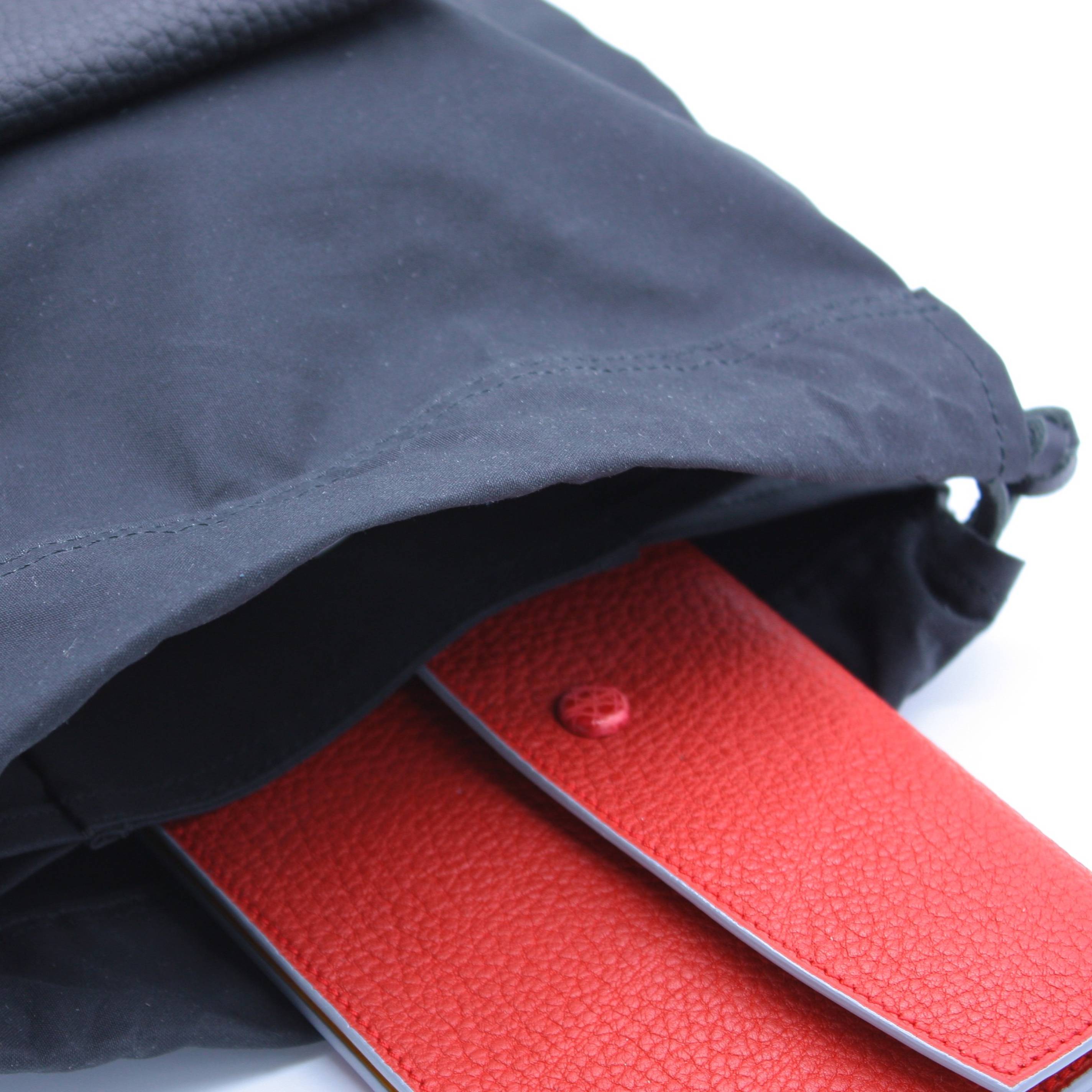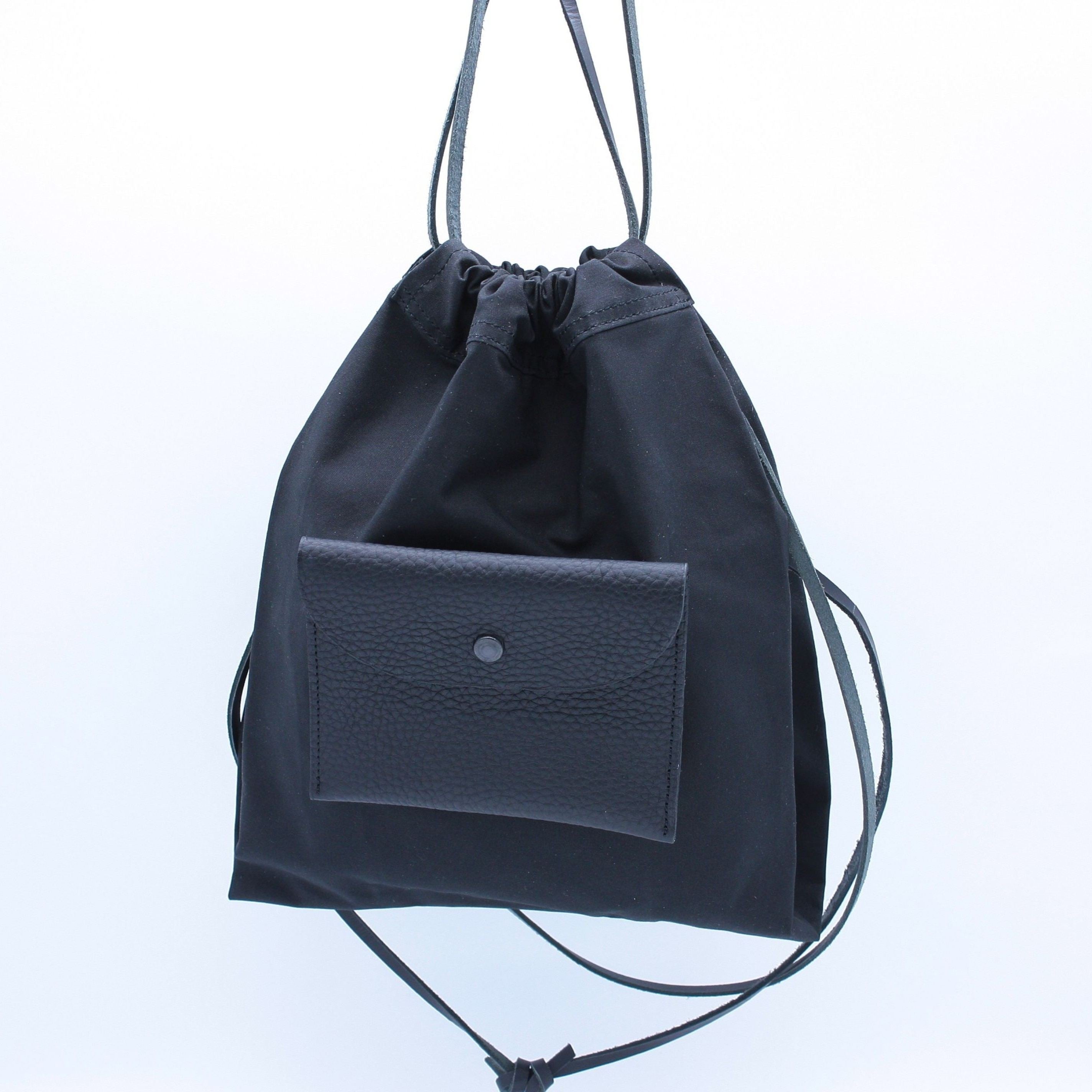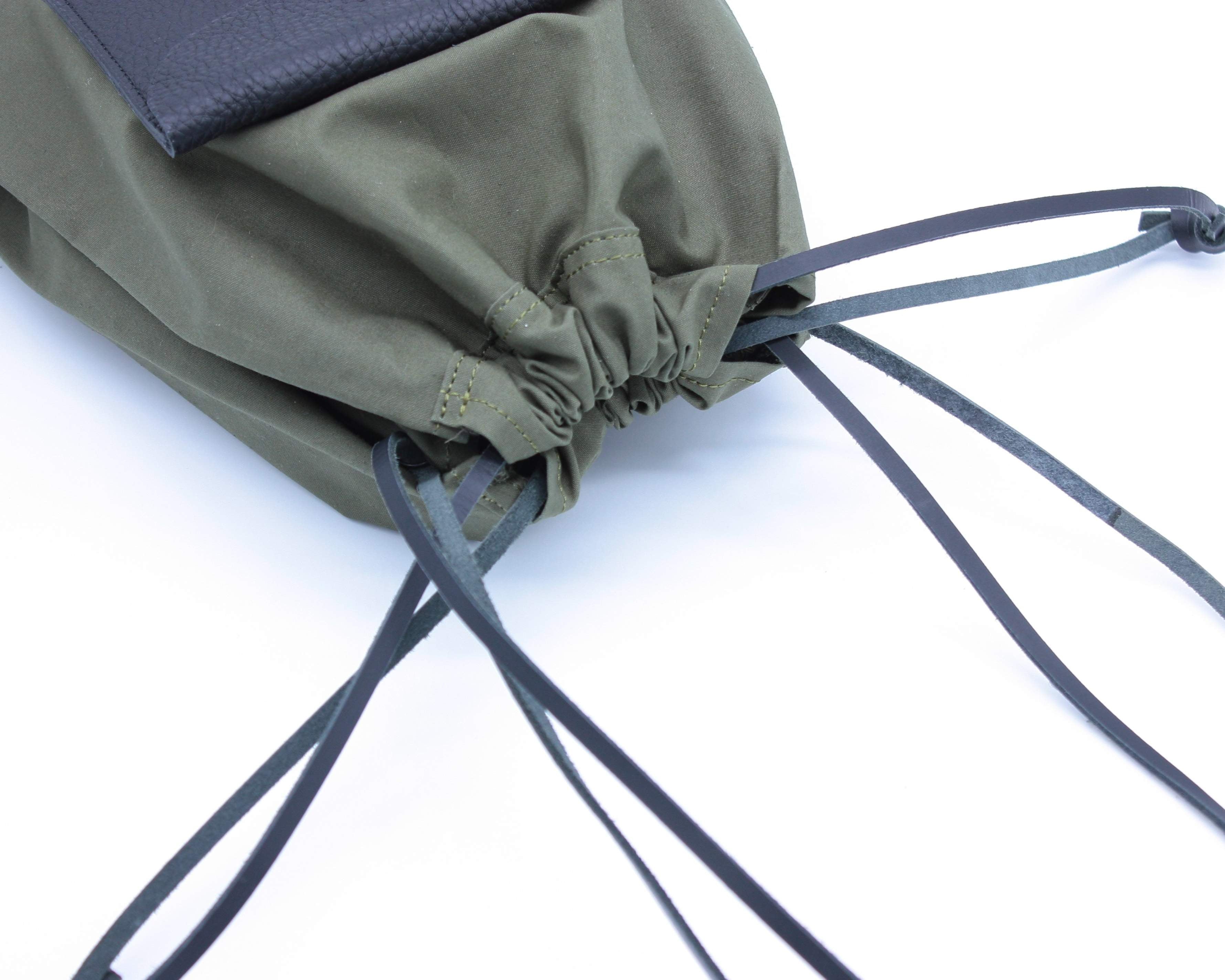 撥水効果のあるイギリス製オイルコットンを使用。使い込むほどにデニムのアタリのようなチョークラインを楽しめます。巾着の難点、荷物の整理のしづらさを改善した2室構造と手持ち・肩掛け・斜め掛けの3WAY仕様がとても便利です。